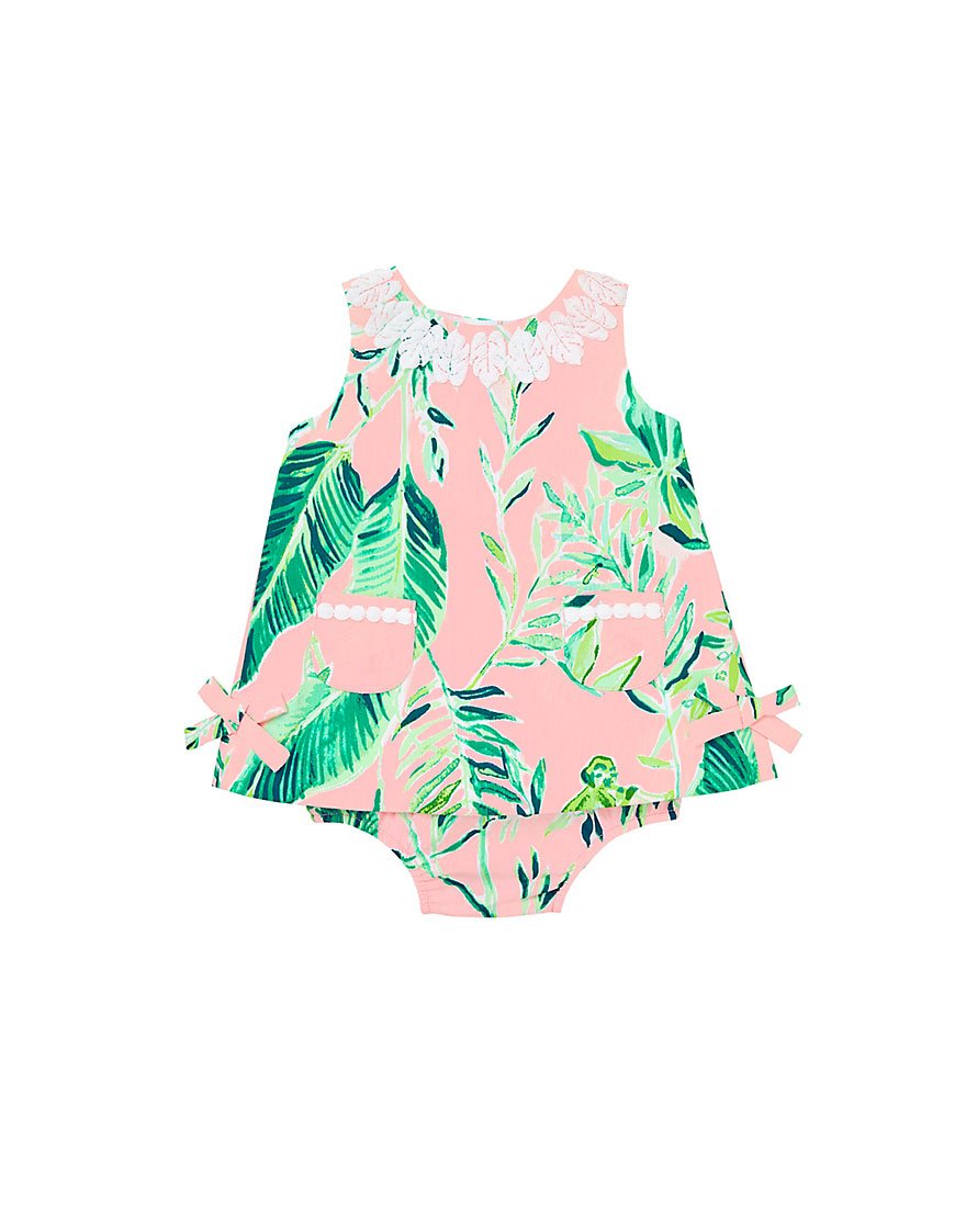 The Baby Lilly Shift is a classic shift dress for babies with matching bloomers and lace trim details.