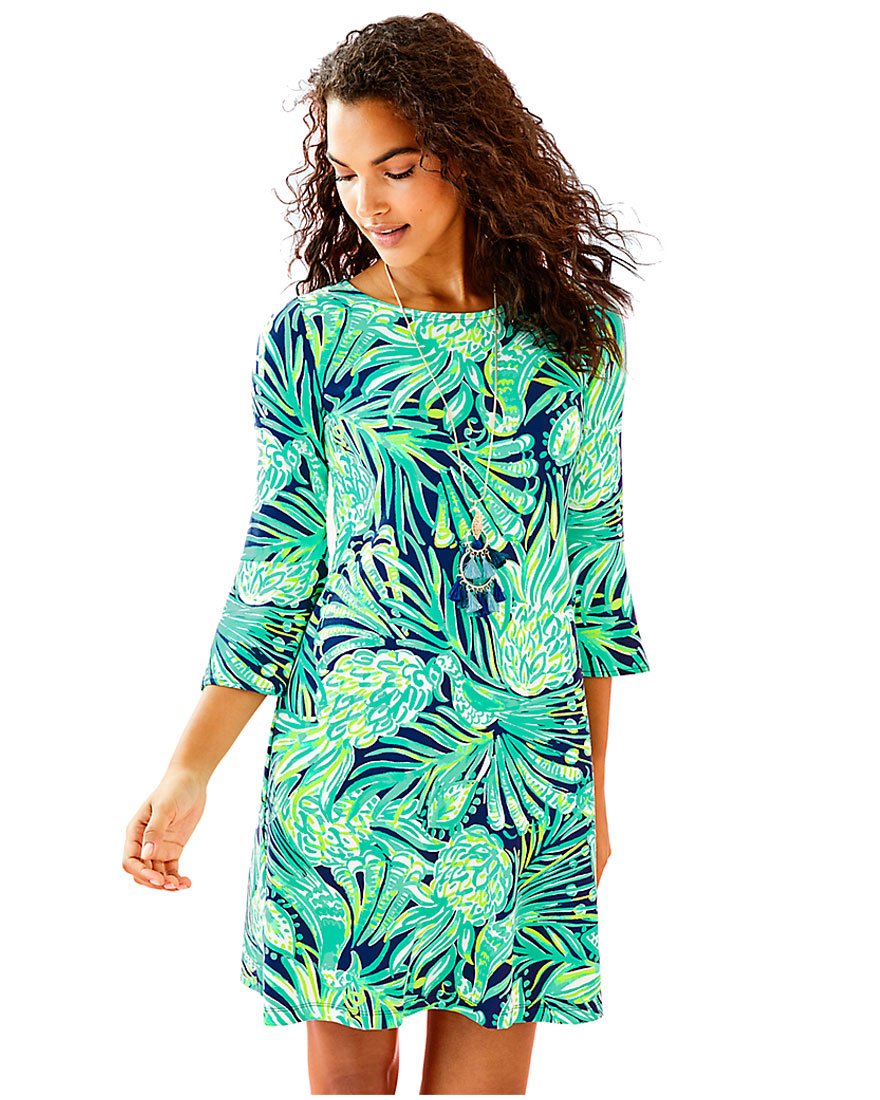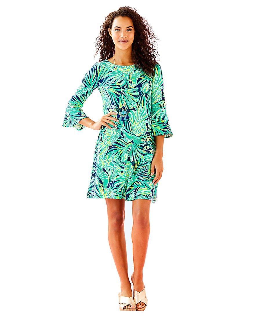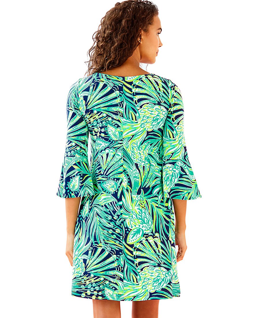Printed Swing Dress With 3/4 Length Flounce Sleeves.